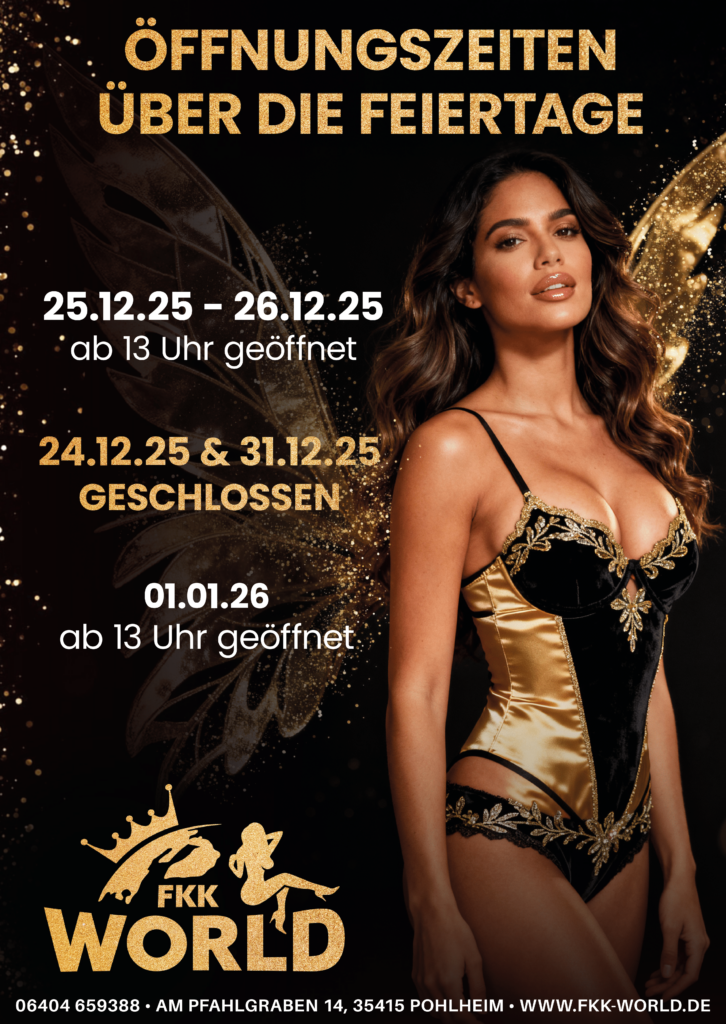 Liebe Gäste, am 31.12. bleibt unsere Location geschlossen. Wir begrüßen Sie ab dem 01.01.2024 ab 13 Uhr wieder im FKK World.
